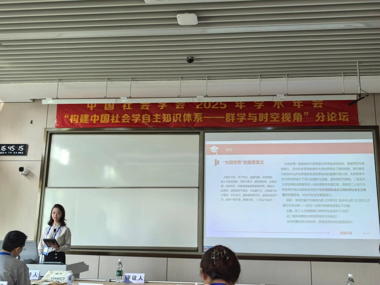 2025年7月5日,2024级社会学专业硕士研究生闫鸣皓参加2025年中国社会学会“构建中国社会学自主知识体系——群学与时空视角”论坛。在此次会议上,闫鸣皓就“何以致大同?——基于对康有为、孙中山关于大同世界设想的差异分析”这一主题进行了汇报。闫鸣皓注意到“大同世界”一词自提出后,一直是中国社会的乌托邦,而康有为与孙中山作为近代改良派和革命派的代表,对大同世界均有深入构想,深入探究二者的思想转变,可能对理解空想社会主义向科学社会主义发展有重要意义。因此,闫鸣皓从二者关于大同世界的实现路径、主要特征及最终目标入手,探究二者思想的差异与联系。在实现路径上,康有为主张 “破九界”;孙中山则以 “民族主义” 为基础,和平实现大同。关于大同特征,二者均提 “平等” 但内涵不同。康有为追求消除一切差异;孙中山侧重去除不平等。最终目标上,康有为以大同为阶段,最终追求个人平等的极乐主义;孙中山则致力于实现国族平等的世界主义。二人思想虽有差异,但都蕴含人本思想、重视 “公”、主张发展机器大工业,这些特征值得我们在当今复杂形势下发展新思想时不断地借鉴和反思,对当今社会有借鉴意义。