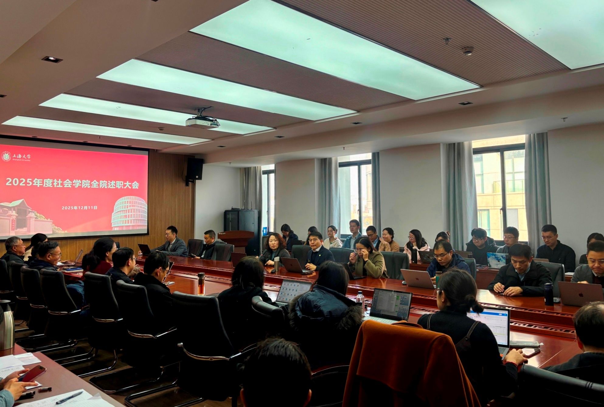 2025年12月11日,社会学院年终述职大会在学院308会议室召开,会议由学院党委书记杨锃主持,学院全体教职工齐聚一堂,共同回顾过去一年的工作成果,同时展望2026年年度规划和学校“综合改革方案”的贯彻落实。