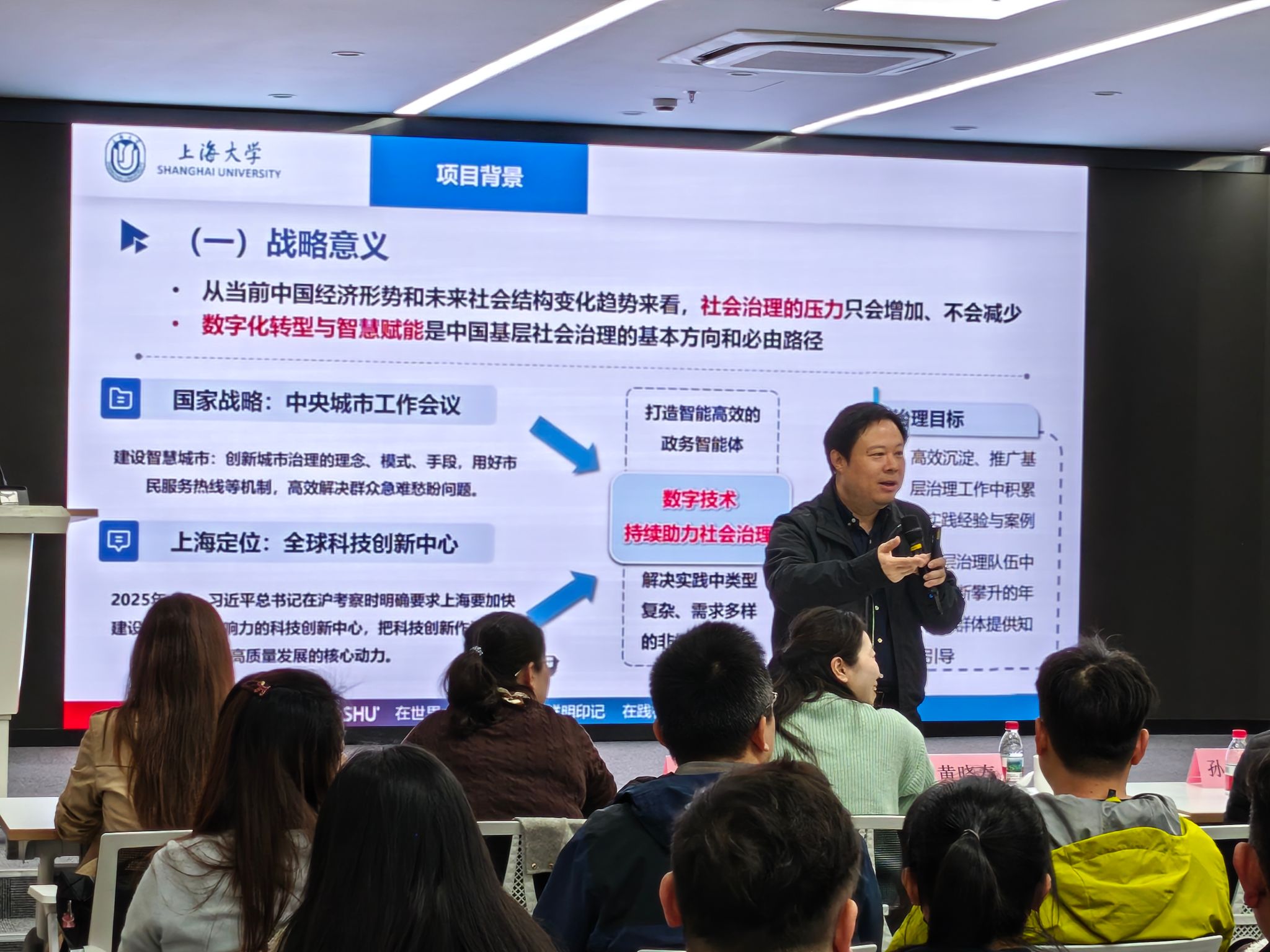 上海大学社会学院院长、基层治理智能体项目负责人黄晓春对项目背景、阶段性成果及试用意义进行了生动介绍。黄晓春教授指出,该项目源于一个长期存在的现实痛点:丰富的基层治理经验,与大模型训练所需的高质量知识库之间,究竟如何实现有效衔接。在黄浦区的试用不仅是对技术研发成果的一次系统检验,更是推动跨学科融合的重要探索,将为超大城市精细化治理创新一套“上大方案”。
