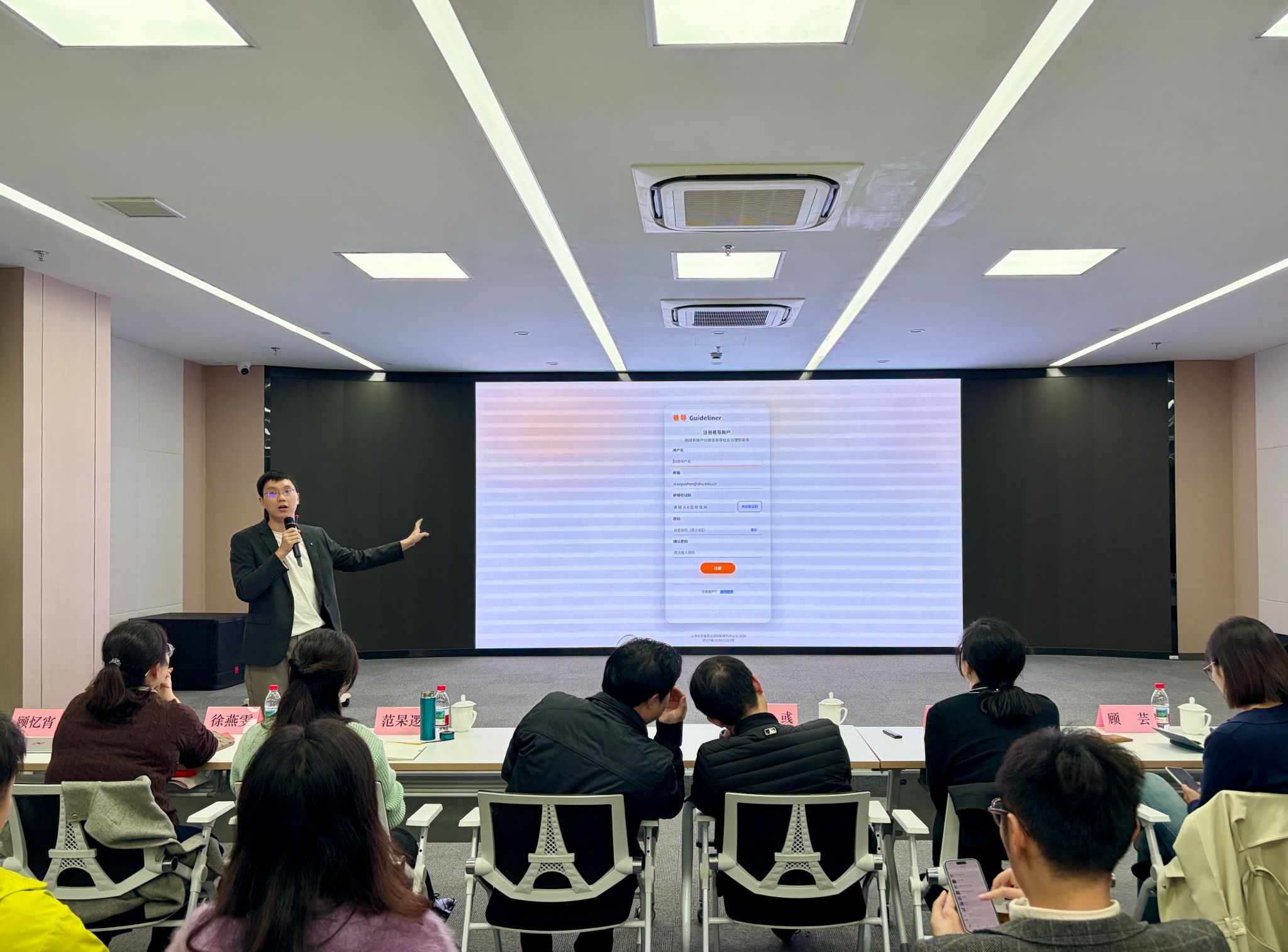 上海大学基层治理智能体项目组成员陈韶晖老师现场演示了智能体的功能模块,并为与会的试用者详细讲解试用方案与操作细则。