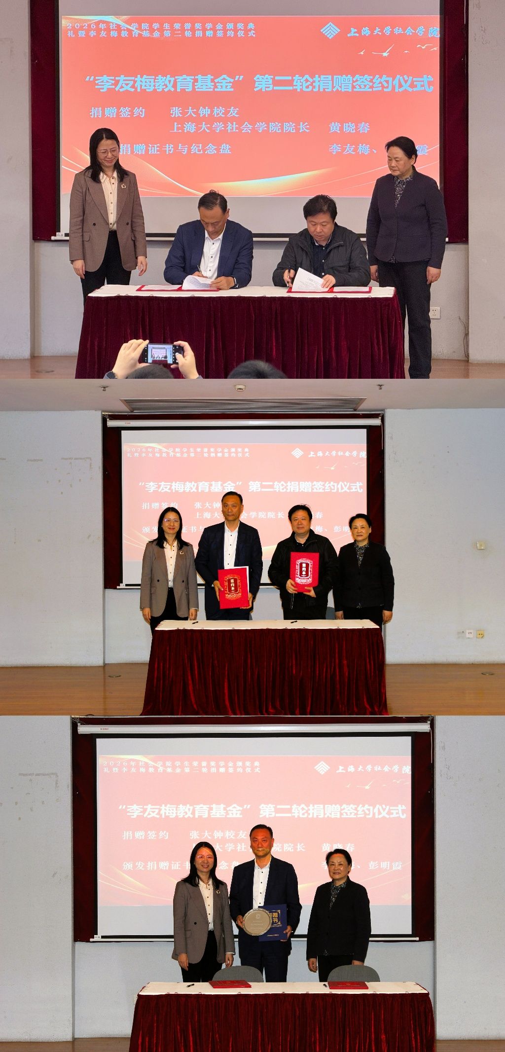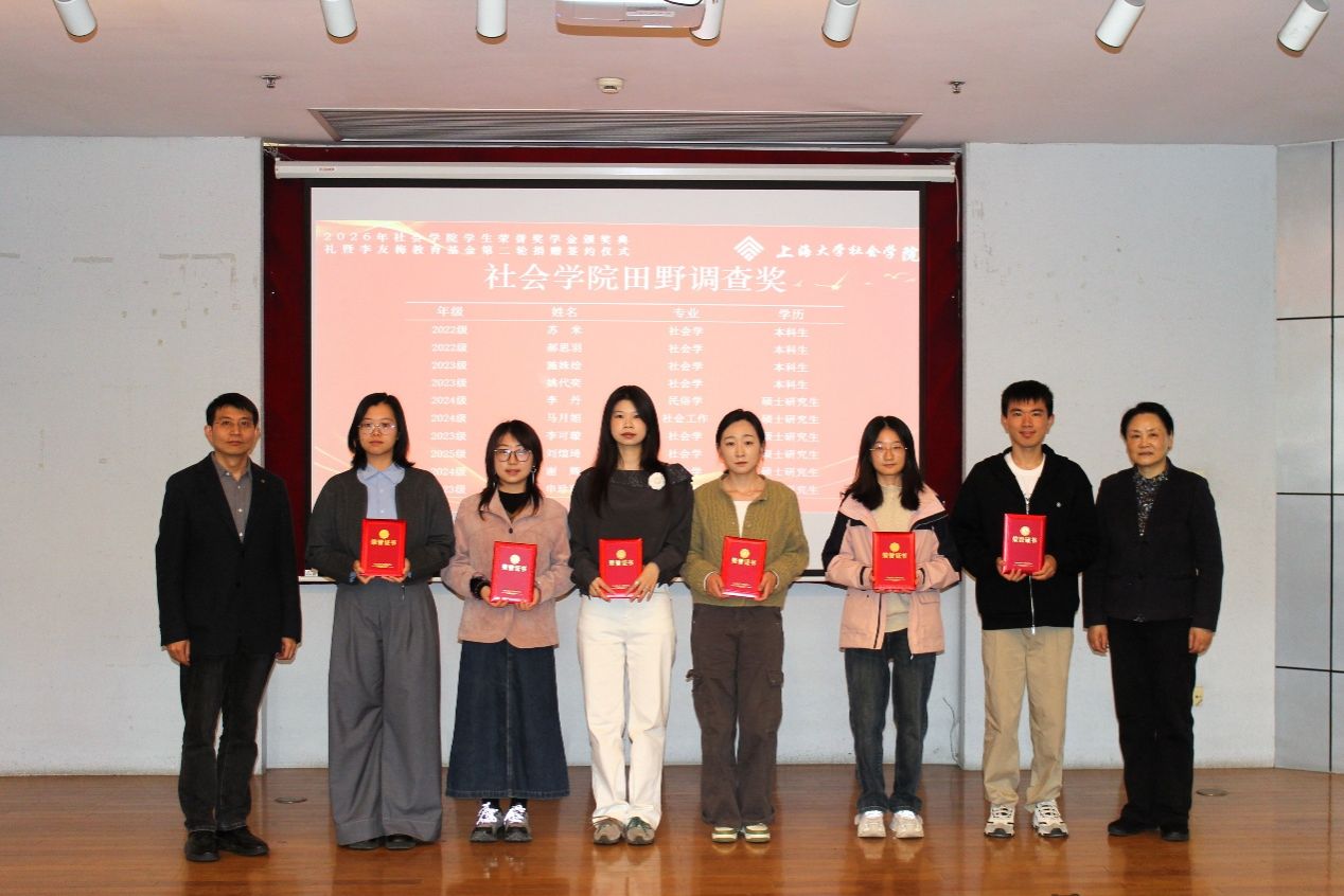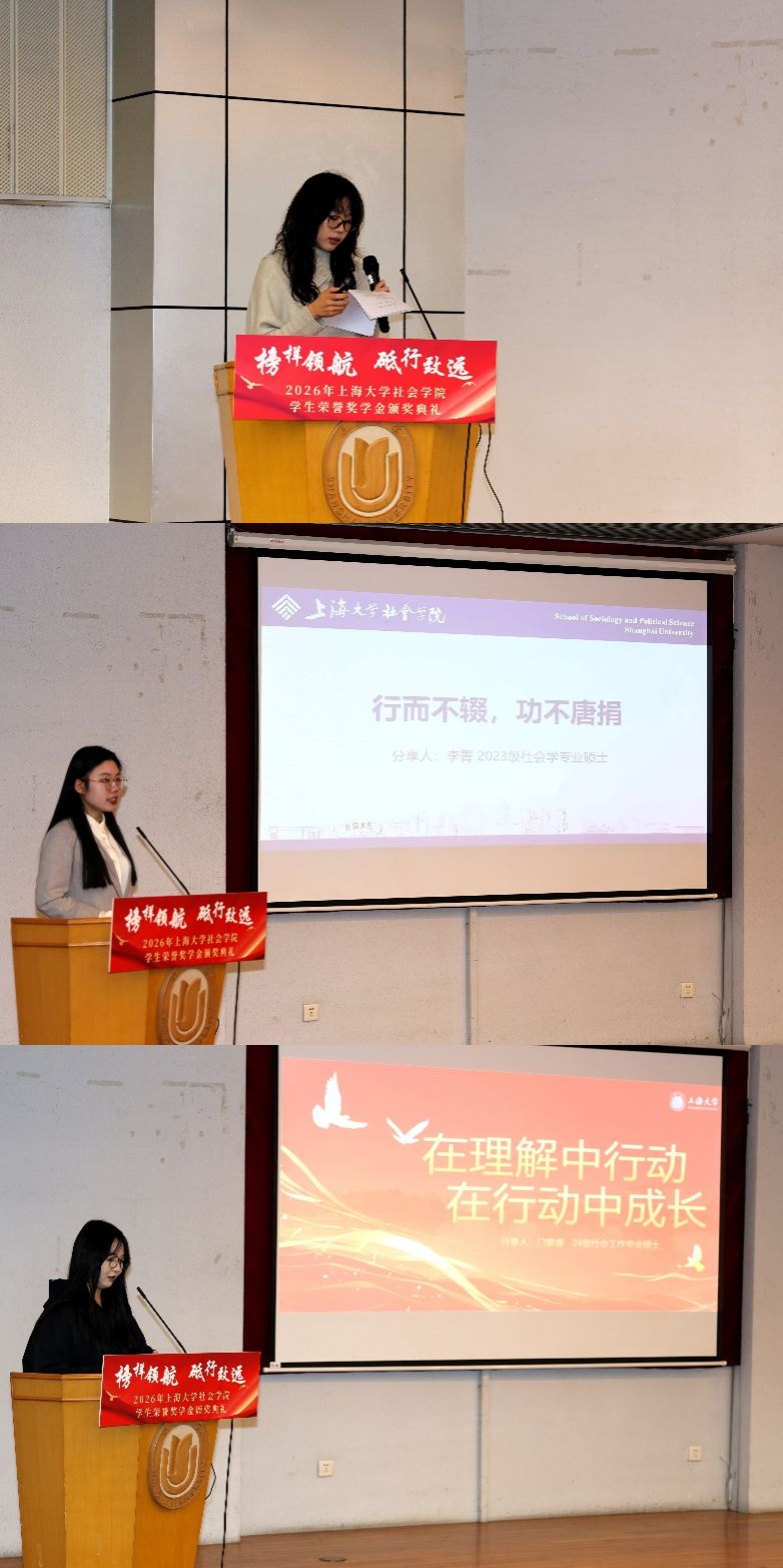 四月春深,万象更新。为强化榜样引领效应,营造崇学尚优的良好氛围,激励社院学子不断进取、全面发展,4月17日下午2点15分,社会学院于上海大学行政楼报告厅隆重举行2026年“榜样领航 砥行致远”荣誉奖学金颁奖典礼暨“李友梅教育基金”第二轮捐赠签约仪式。