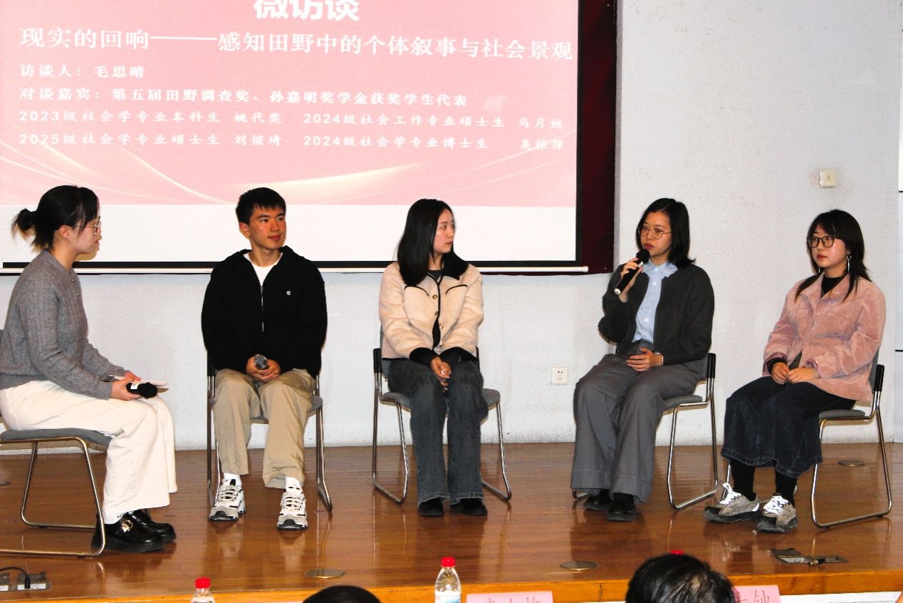 为拓展同学们对田野调查的认知视野,主持人毛思晴同学与第五届田野调查奖、孙嘉明奖学金获奖学生代表进行了以“田野纪实——个体叙事与社会图景的对话”为主题的微访谈。