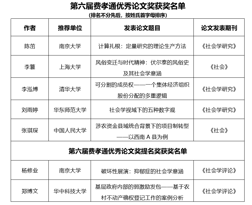 自2025年5月29日发布“第六届费孝通优秀论文奖”评选公告以来,共收到来自清华大学、中国人民大学、南京大学等高校推荐的若干篇优秀论文。通过费孝通优秀论文评审委员会的专家评审,现将第六届费孝通优秀论文奖和提名奖公示如下: