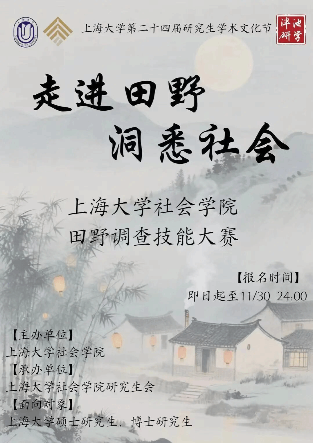 在深入社会现场、体察真实生活的实践中,田野调查始终是社会科学研究的重要起点。为引导学生在真实社会情境中深化问题意识、提升研究能力,上海大学社会学院举办了“走进田野·洞悉社会”田野调查技能大赛。活动以田野调查为核心方法,鼓励同学们通过亲身参与、持续观察与深入访谈,在具体经验中理解社会结构与个体处境,探索理论与现实之间的互动关系。