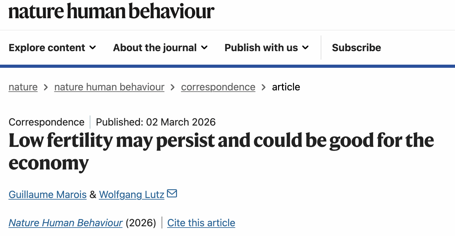 人口学研究所暨亚洲人口研究中心(ADRI)Guillaume Marois教授与特聘教授Wolfgang Lutz院士于2026年3月2日在国际顶级学术期刊《自然-人类行为》(Nature Human Behaviour)上发表题为“Low fertility may persist and could be good for the economy”(低生育率或将持续,且可能有利于经济发展)的最新研究成果。Lutz院士为通讯作者,上海大学为文章通讯作者单位,这也是亚洲人口研究中心在国际顶级期刊发表上的又一重要突破。