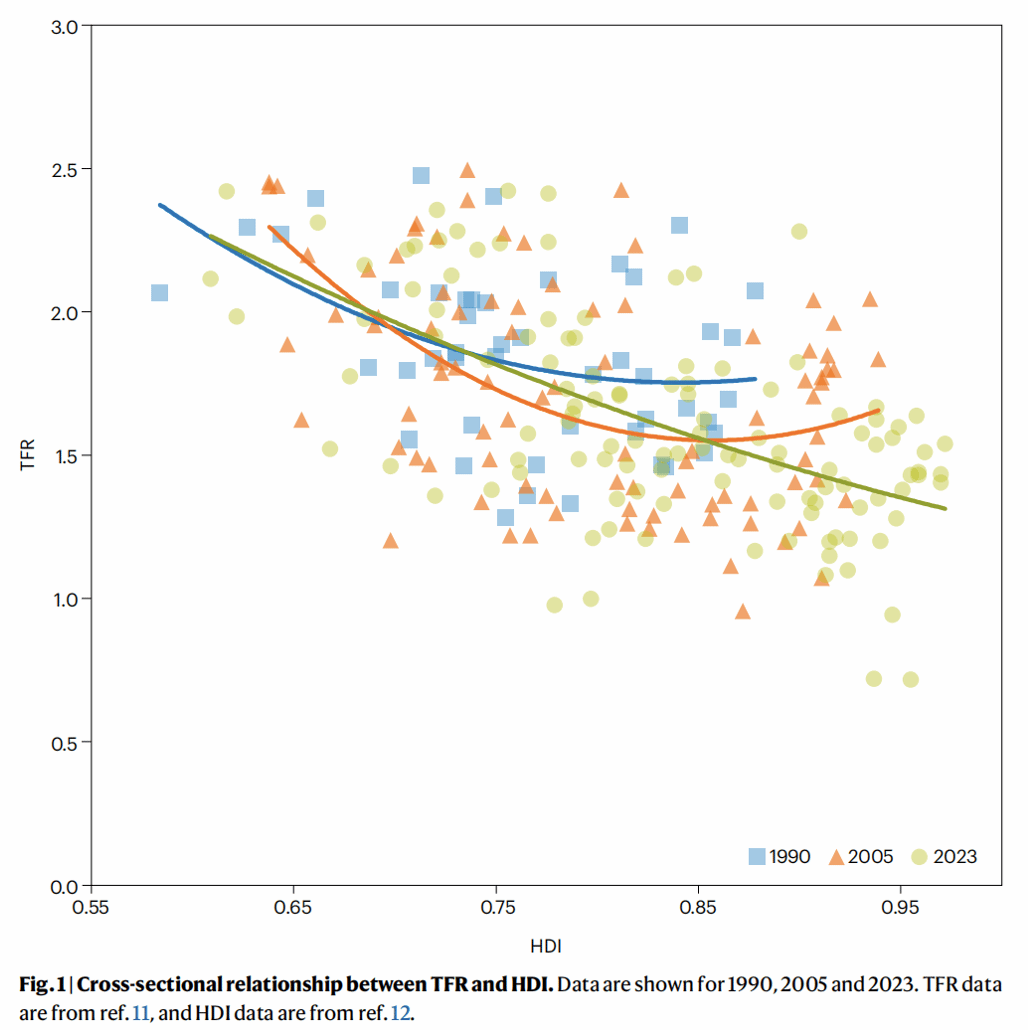 长期以来,总和生育率远低于2.1的现象被视为高收入国家的主要担忧。该研究分析2023年最新数据发现,随着人类发展指数(HDI)的提升,生育率未出现反弹,并呈现出明确的负相关性,表明低生育率在发达经济体中可能长期持续。研究强调,决定社会福祉的关键因素并非人口总量,而是人口结构以及由教育驱动的劳动生产率。在较低的生育水平下,家庭和政府能够增加对每个孩子的教育投入,这种人力资本的质量提升配合资本深化效应,能够有效补偿劳动人口数量的减少。模型测算显示,在考虑代际转移和技术进步的情况下,能够最大化人均消费水平的最优生育率通常远低于更替水平(即总和生育率为2.1),往往在1.5甚至更低。因此,政策制定者不应盲目追求生育率的回升,而应将战略重点转向提升人口素质与科技创新,以应对人口转型带来的长远挑战。