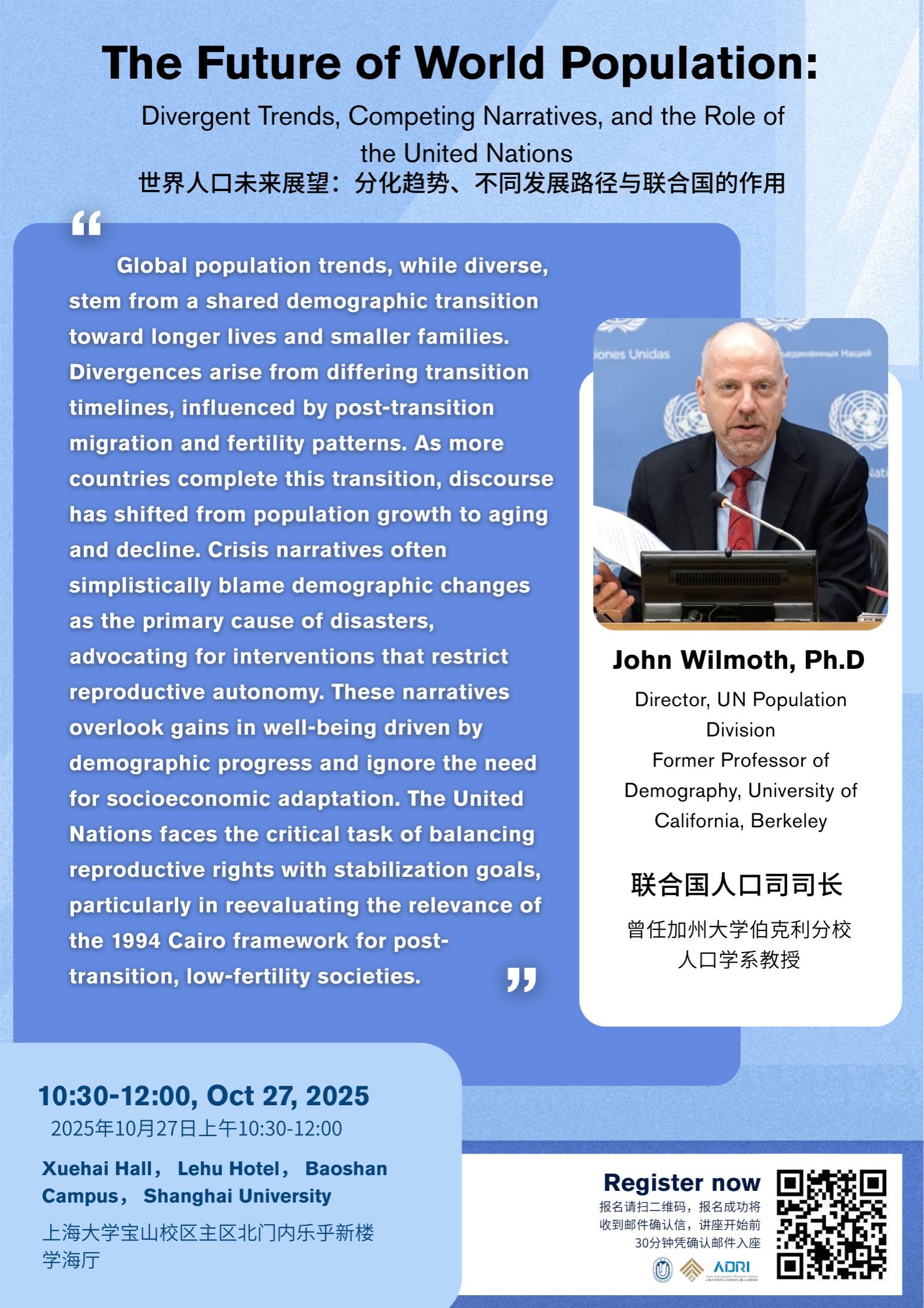 讲座主题:The Future of World Population: Divergent Trends, Competing Narratives, and the Role of the United Nations(世界人口未来展望:分化趋势、不同发展路径与联合国的作用)