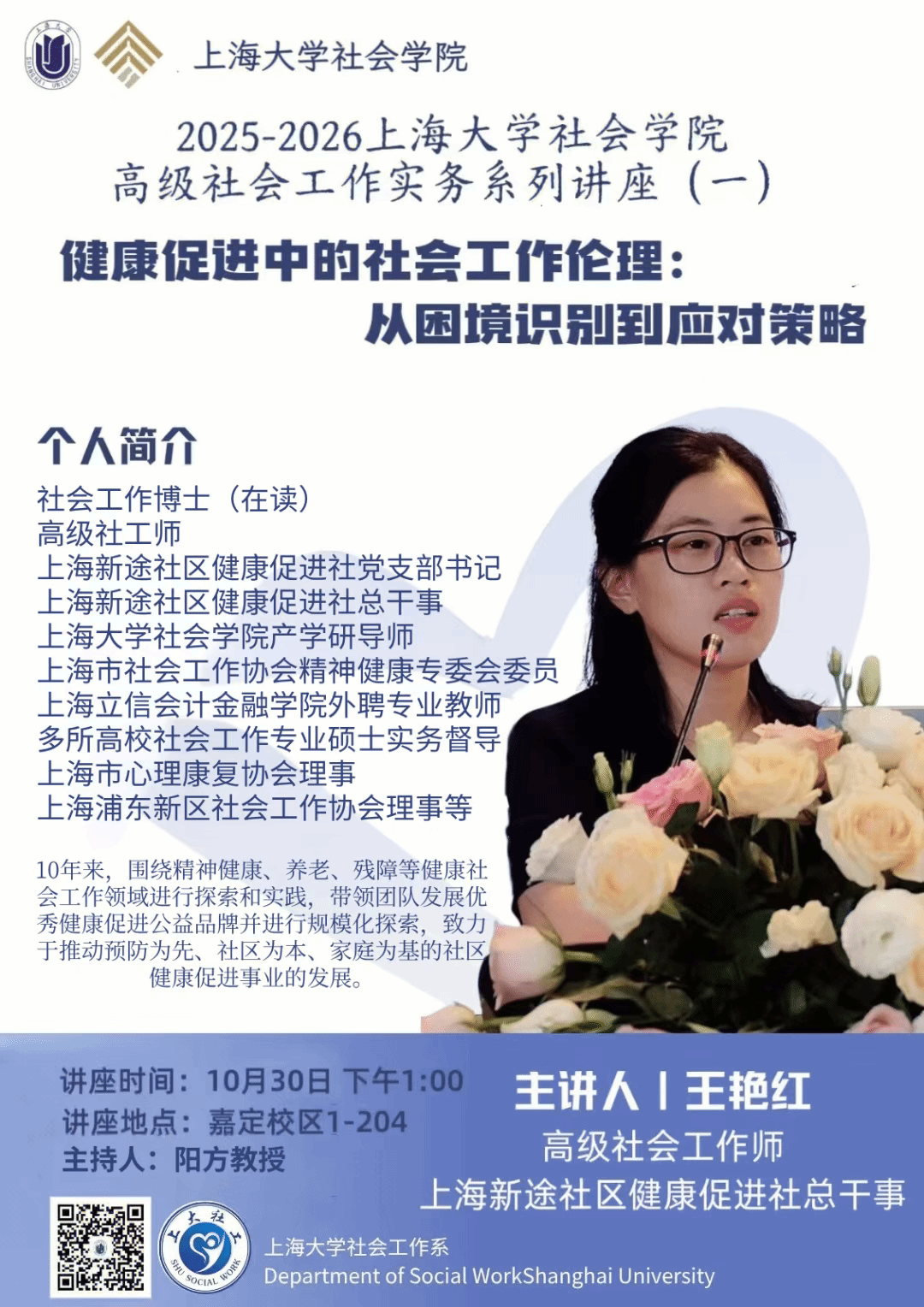 主讲人:王艳红,社会工作博士(在读),高级社工师,上海新途社区健康促进社党支部书记、总干事;同时担任上海大学社会学院产学研导师、上海立信会计金融学院外聘专业教师、多所高校社会工作专业硕士实务督导、上海市心理康复协会理事、上海市社会工作协会精神健康专委会委员、上海浦东新区社会工作协会理事等。10年来,围绕精神健康、养老、残障等健康社会工作领域进行探索和实践,带领团队发展优秀健康促进公益品牌并进行规模化探索,致力于推动预防为先、社区为本、家庭为基的社区健康促进事业的发展。