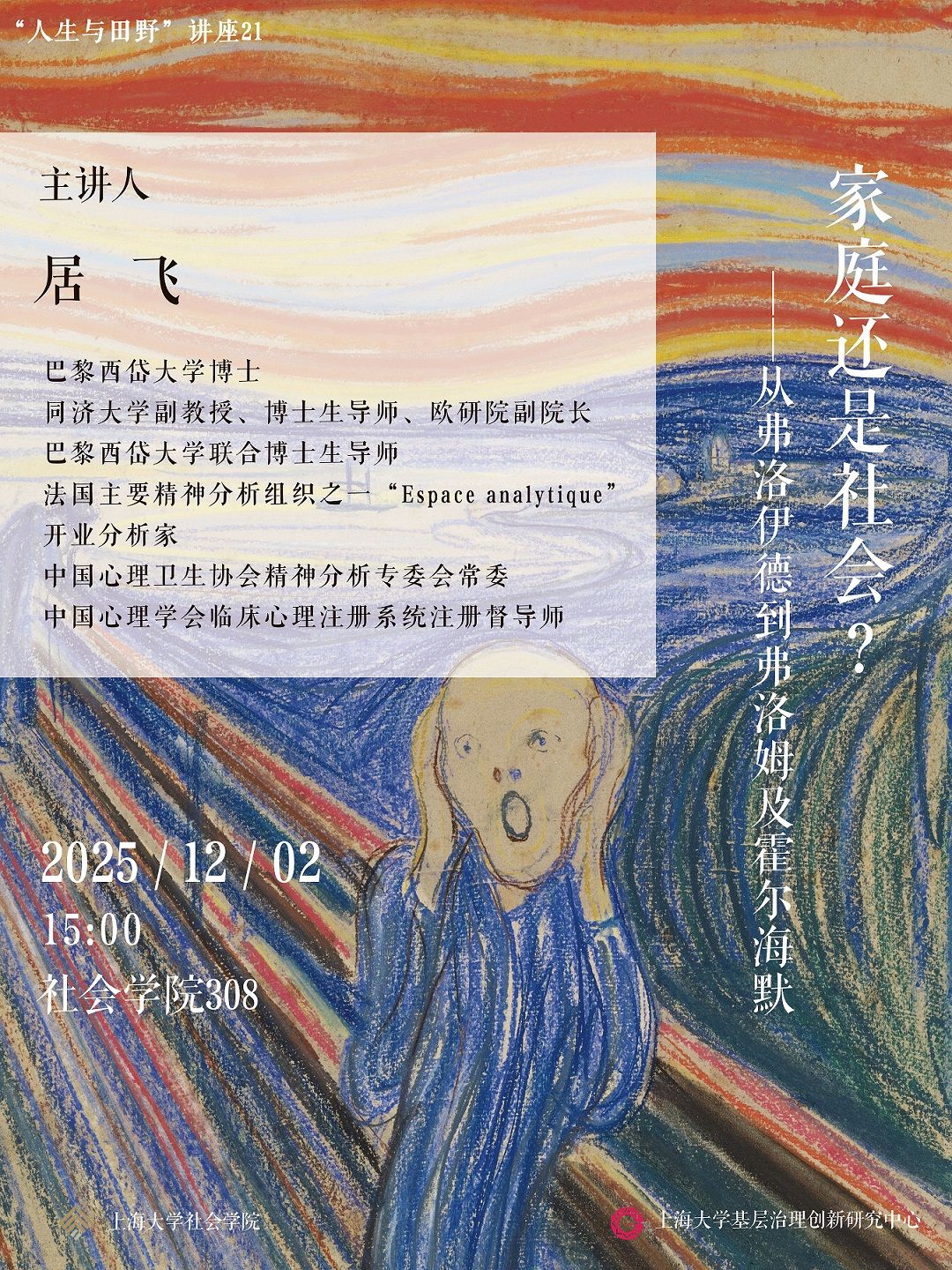 主讲人:居飞,巴黎西岱大学博士,同济大学副教授、博士生导师、欧研院副院长,巴黎西岱大学联合博士生导师。法国主要精神分析组织之一“Espace analytique”,开业分析家。中国心理卫生协会精神分析专委会常委,中国心理学会临床心理注册系统注册督导师。
