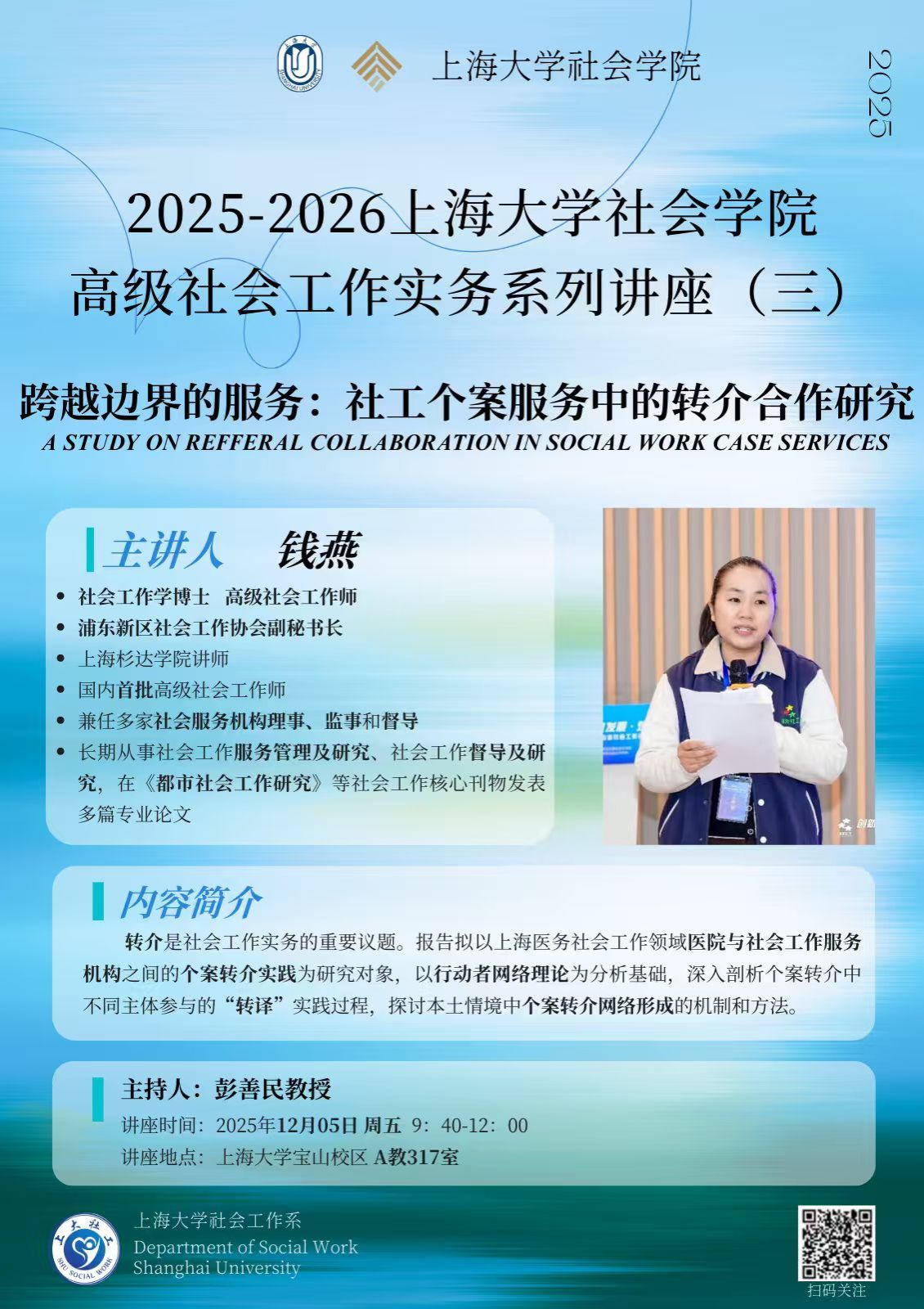 主讲人:钱燕,上海市浦东新区社会工作协会副秘书长,研发部主任,社会工作学博士,国内首批高级社会工作师,兼任多家社会服务机构理事、监事和督导。长期从事社会工作服务管理及研究、社会工作督导及研究,在《都市社会工作研究》等社会工作核心刊物发表多篇专业论文。