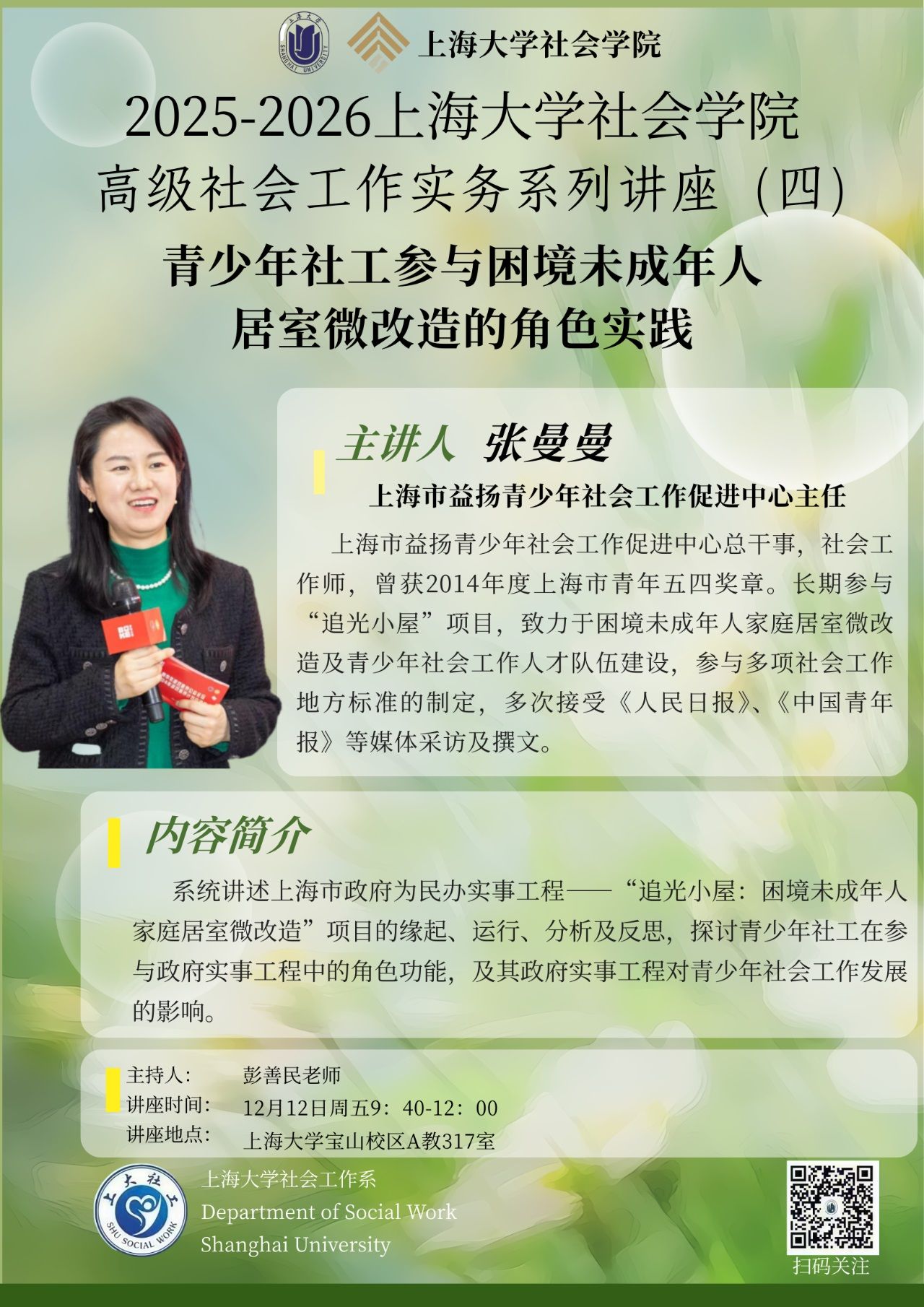 主讲人:张曼曼,上海市益扬青少年社会工作促进中心总干事,社会工作师,曾获2014年度上海市青年五四奖章。长期参与“追光小屋”项目,致力于困境未成年人家庭居室微改造及青少年服务工作和青少年社会工作人才培育工作,参与多项社会工作地方标准的制定,多次接受《中国青年报》等媒体采访。