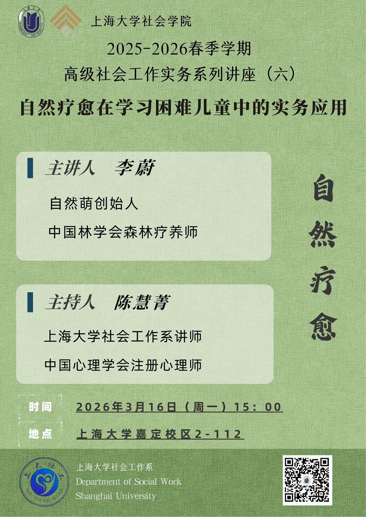 本次讲座是一次跨学科对话的尝试,我们期待共同探讨:社会工作如何借鉴自然疗愈的理念与方法?质性研究与量化评估如何在自然干预中实现有效结合?从情绪到执行功能、从感官统合到社交融入,自然疗愈能否成为串联多学科干预路径的共通语言?