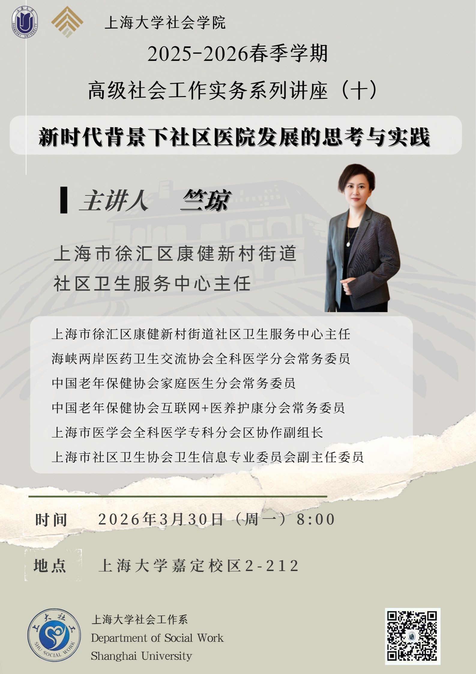 内容简介:在新时代健康中国战略深入实施与分级诊疗制度加速推进的背景下,社区医院正迎来从"医疗末梢"向"健康守门人"转型的关键机遇期。本次讲座将围绕这一主题,首先剖析当前社区医院面临的发展困境,探讨医防融合服务模式构建、智慧化健康管理平台搭建、特色专科差异化发展等可行路径。讲座将重点阐述社会工作专业力量介入社区医院建设的独特价值——从患者心理社会支持、慢性病自我管理小组培育,到医患沟通桥梁搭建、社区健康资源整合,社会工作与基层医疗的深度融合正成为提升服务温度与效能的重要突破口。