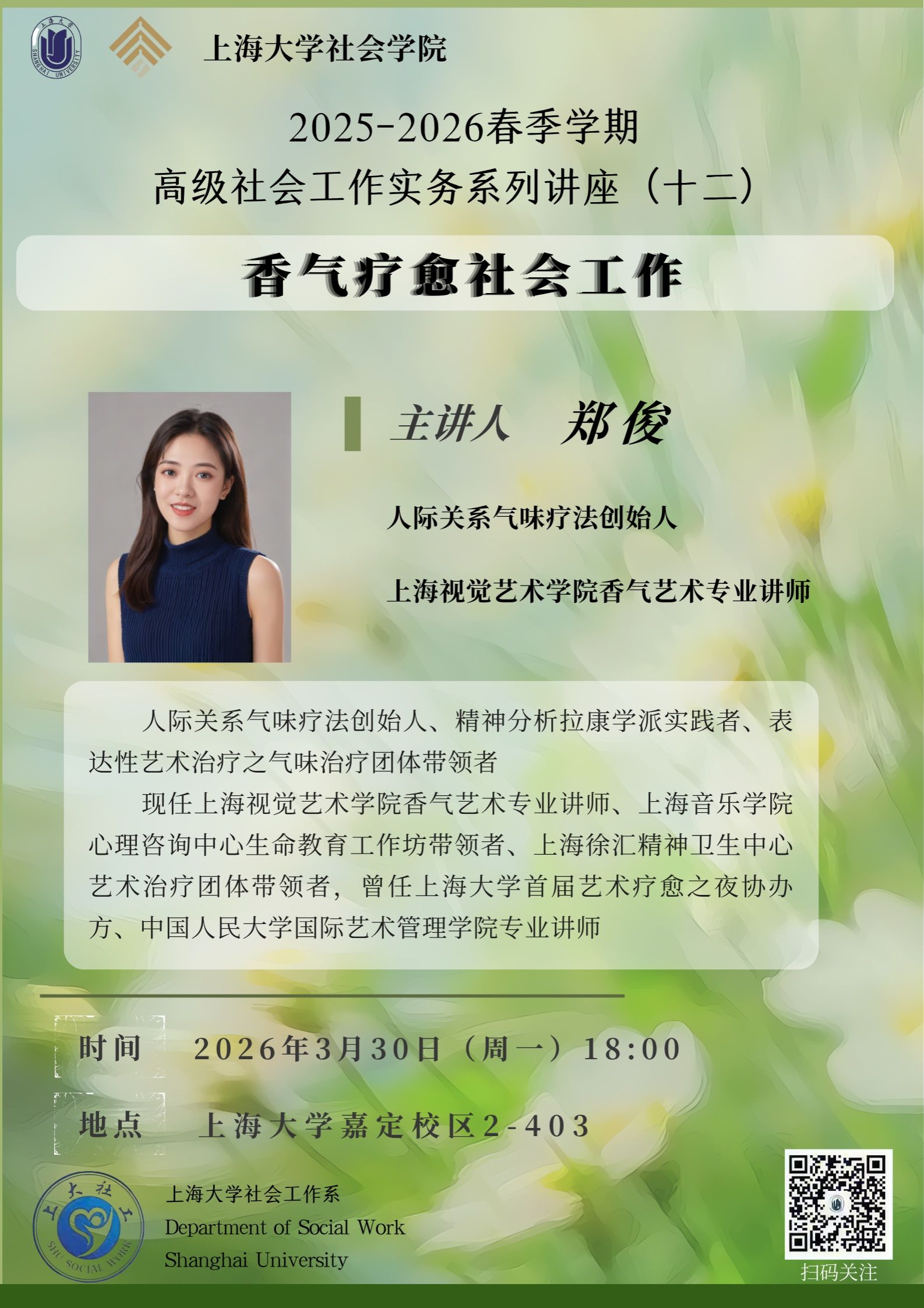 主讲人:郑俊,人际关系气味疗法创始人、精神分析拉康学派实践者、表达性艺术治疗之气味治疗团体带领者。现任上海视觉艺术学院香气艺术专业讲师、上海音乐学院心理咨询中心生命教育工作坊带领者、上海徐汇精神卫生中心艺术治疗团体带领者,曾任上海大学首届艺术疗愈之夜协办方、中国人民大学国际艺术管理学院专业讲师