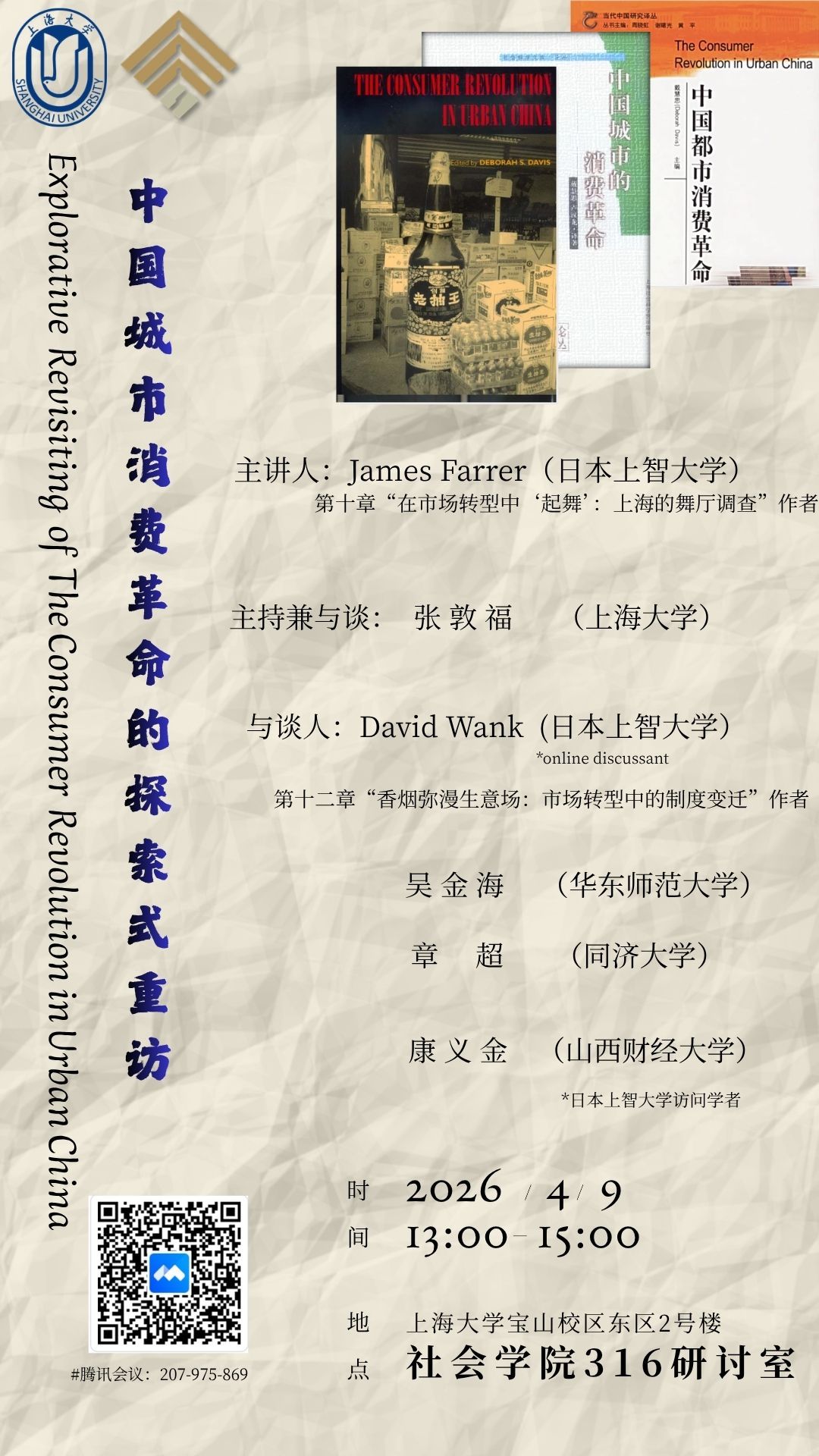 主讲人:James FARRER 教授,中文名字刘雅格、范雅谷,芝加哥大学社会学博士,日本上智大学社会学教授。他的研究集中在上海和东京的都市生活,包括美食、夜生活、移民社区以及都市文化。在上智大学教授社会学时,他强调培养学生的定性研究实践技能,鼓励他们结合以往社会学研究的洞见,利用原始数据撰写关于社会现象的论文。