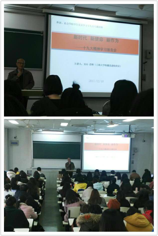 2017年12月10日下午,社会学院联合外语学院在CJ楼303室进行主题为“新时代、新使命、新作为:十九大精神学习报告会”的形势教育和党员党课培训。党课由上海大学特邀党建组织员安山老师主讲,社会学院辅导员和外语学院辅导员以及全体社会学院、外语学院学生党员一同参加党课。