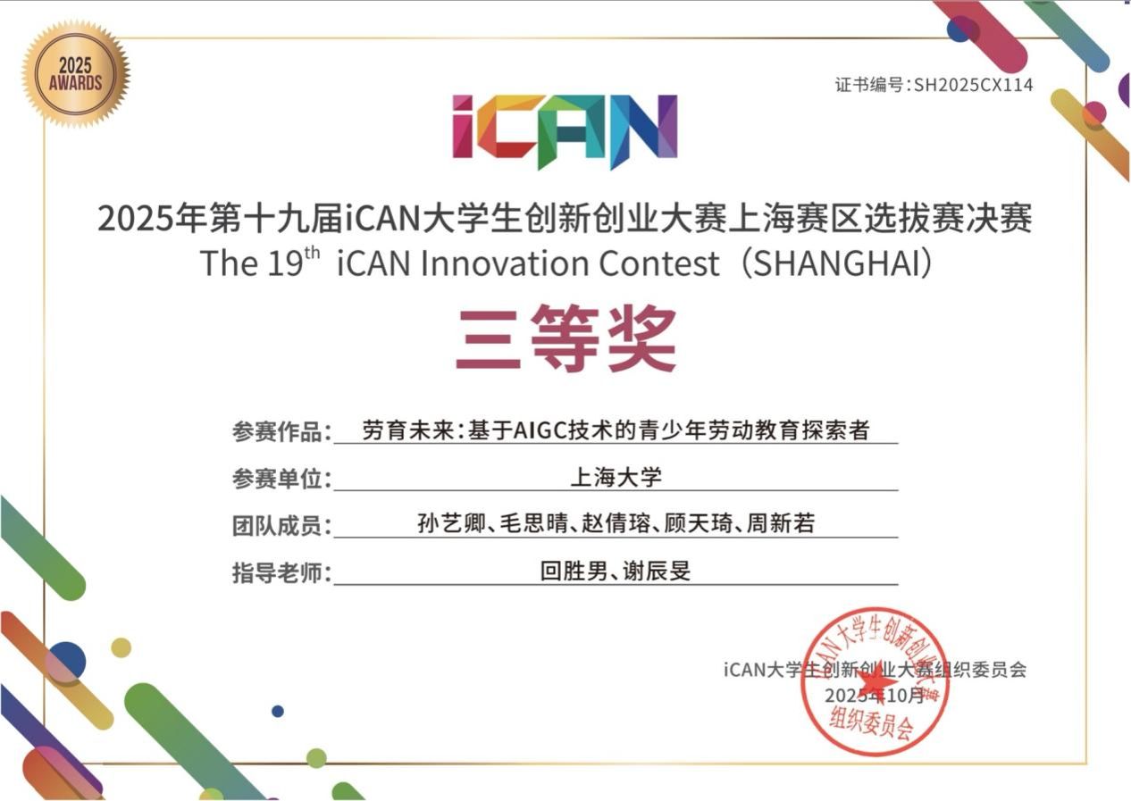 在刚刚落幕的2025年第十九届iCAN大学生创新创业大赛上海赛区选拔赛决赛中,由孙艺卿、毛思晴、赵倩瑢、顾天琦、周新若组成的参赛团队,凭借作品《劳育未来:基于AIGC技术的青少年劳动教育探索者》,荣获三等奖的佳绩!