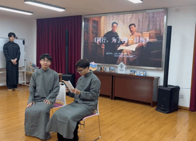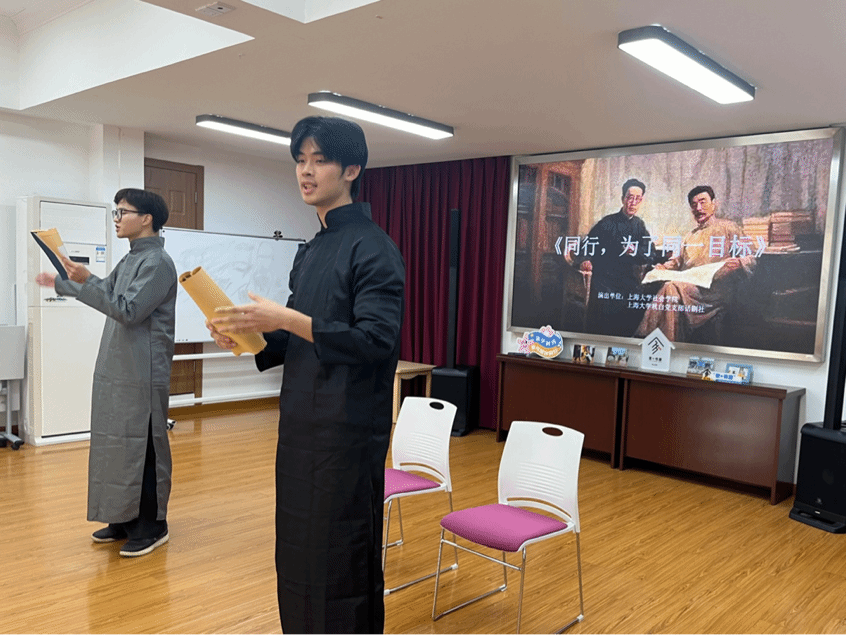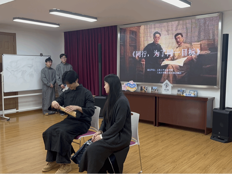 12月27日下午,“家+书屋”主题系列活动——“书屋里的中国红”第三次活动,在宝山区妇女儿童发展中心暖心启幕!本次活动,上海大学社会学院的同学们再次将原创历史剧目《同行,为了同一目标》带上舞台,以鲁迅与瞿秋白的真实故事为蓝本,讲述动荡年代里,志同道合者以文会友、以心相交、共赴理想的动人往事。