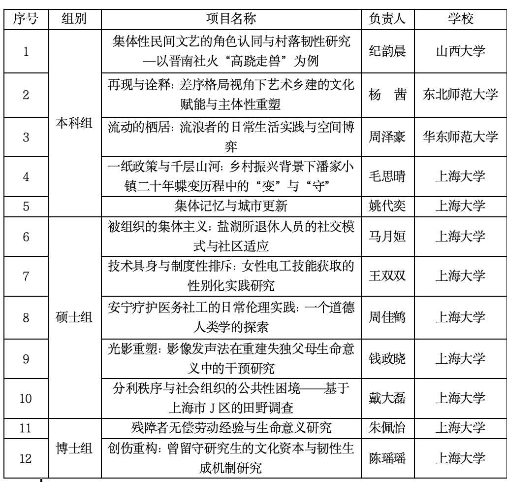 第五届费孝通田野调查项目资助计划共计资助了20项全国高校本科生项目和30项校内本硕博学生项目,为上百名有志钻研学术的青年学生提供支持,鼓励青年学生走进田野,分析社会、了解民情、关注民生。现经专家评审,共有12项结项报告获评优秀,具体名单如下(以负责人姓氏笔画为序):